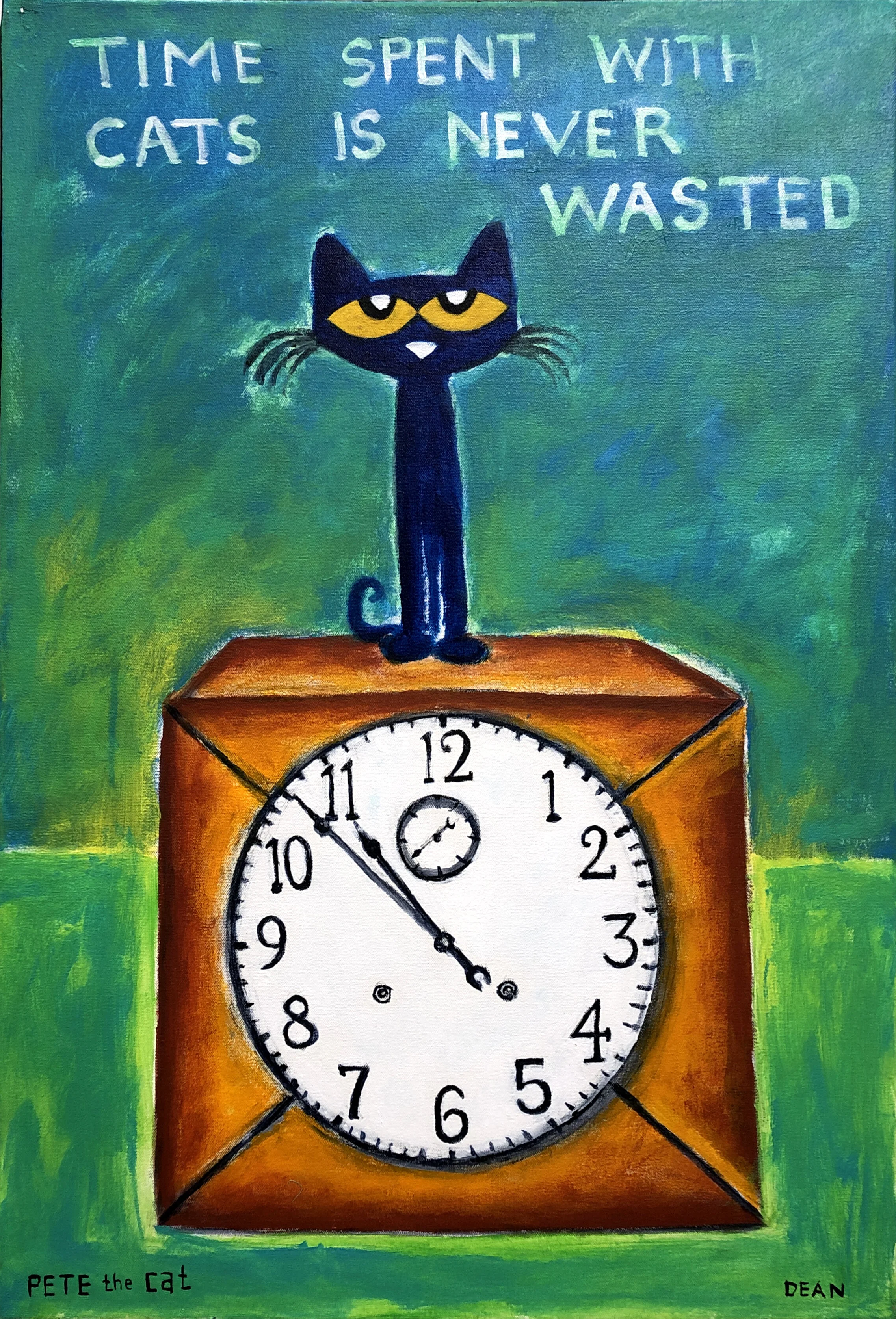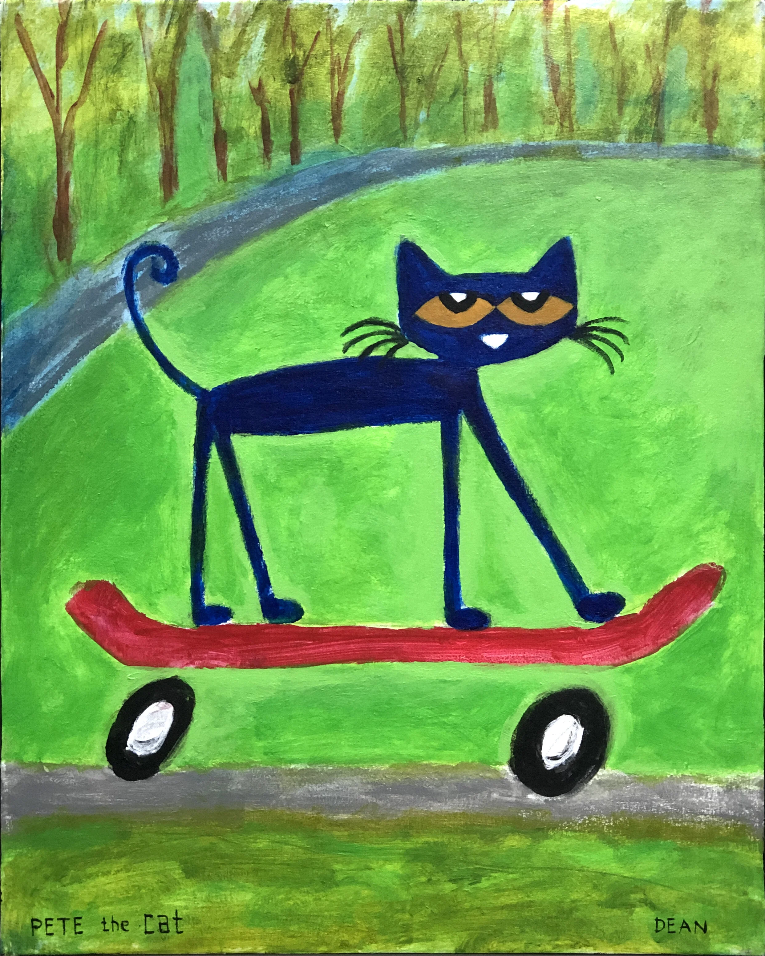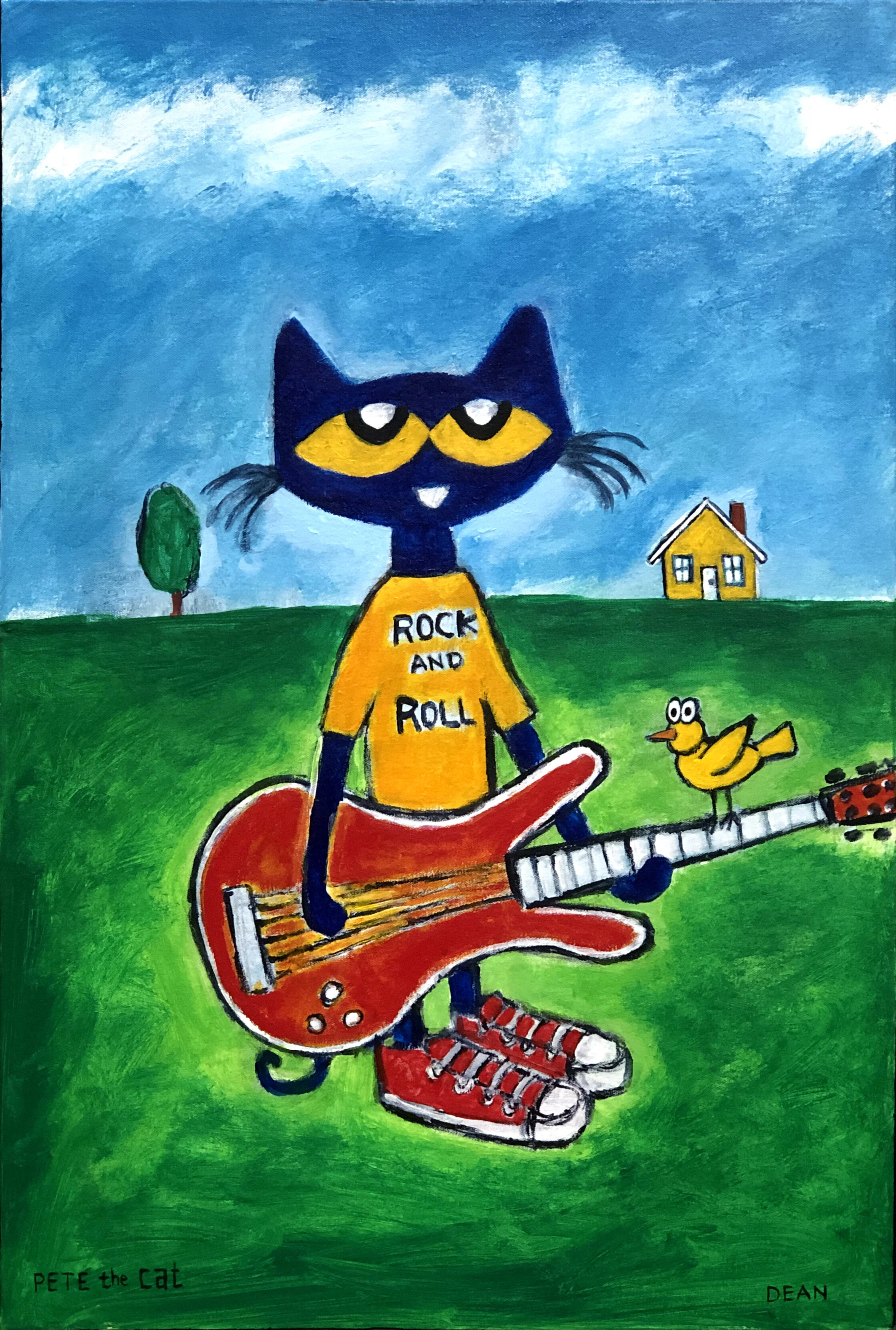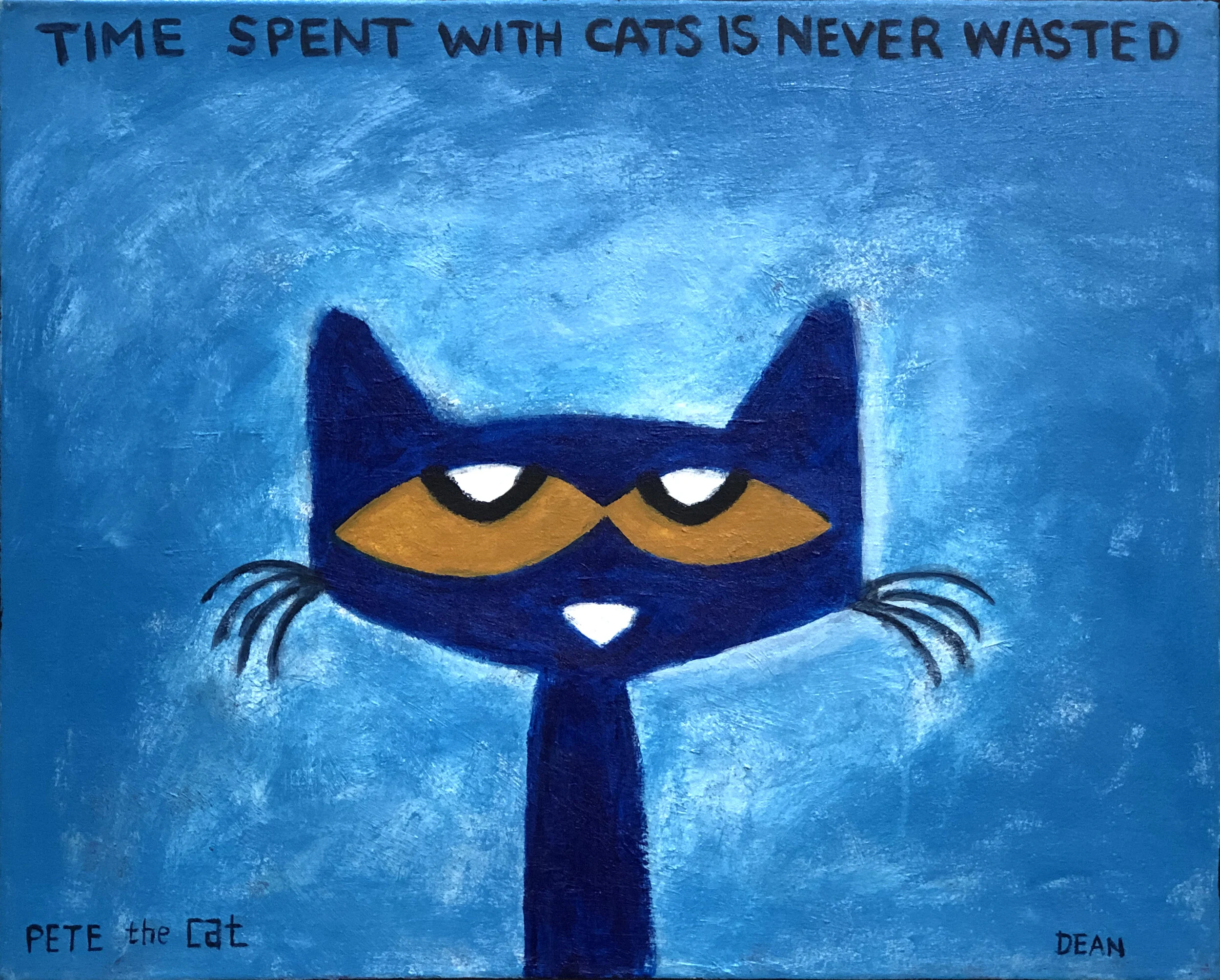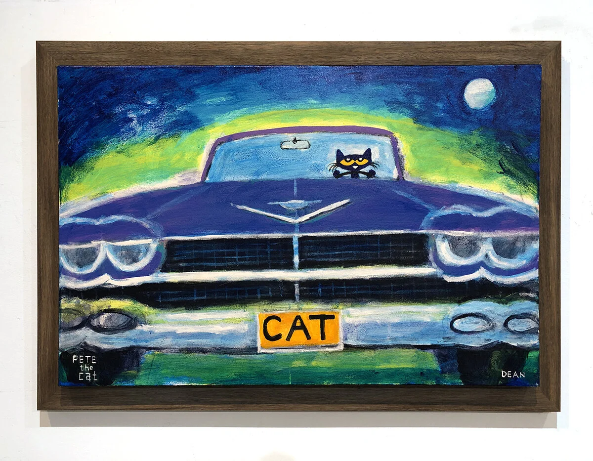 It was during this time that he began creating paintings and drawing of his cat, Pete. The little blue cat showed up as a character in James’s artwork around 1999 and has been a permanent fixture ever since.