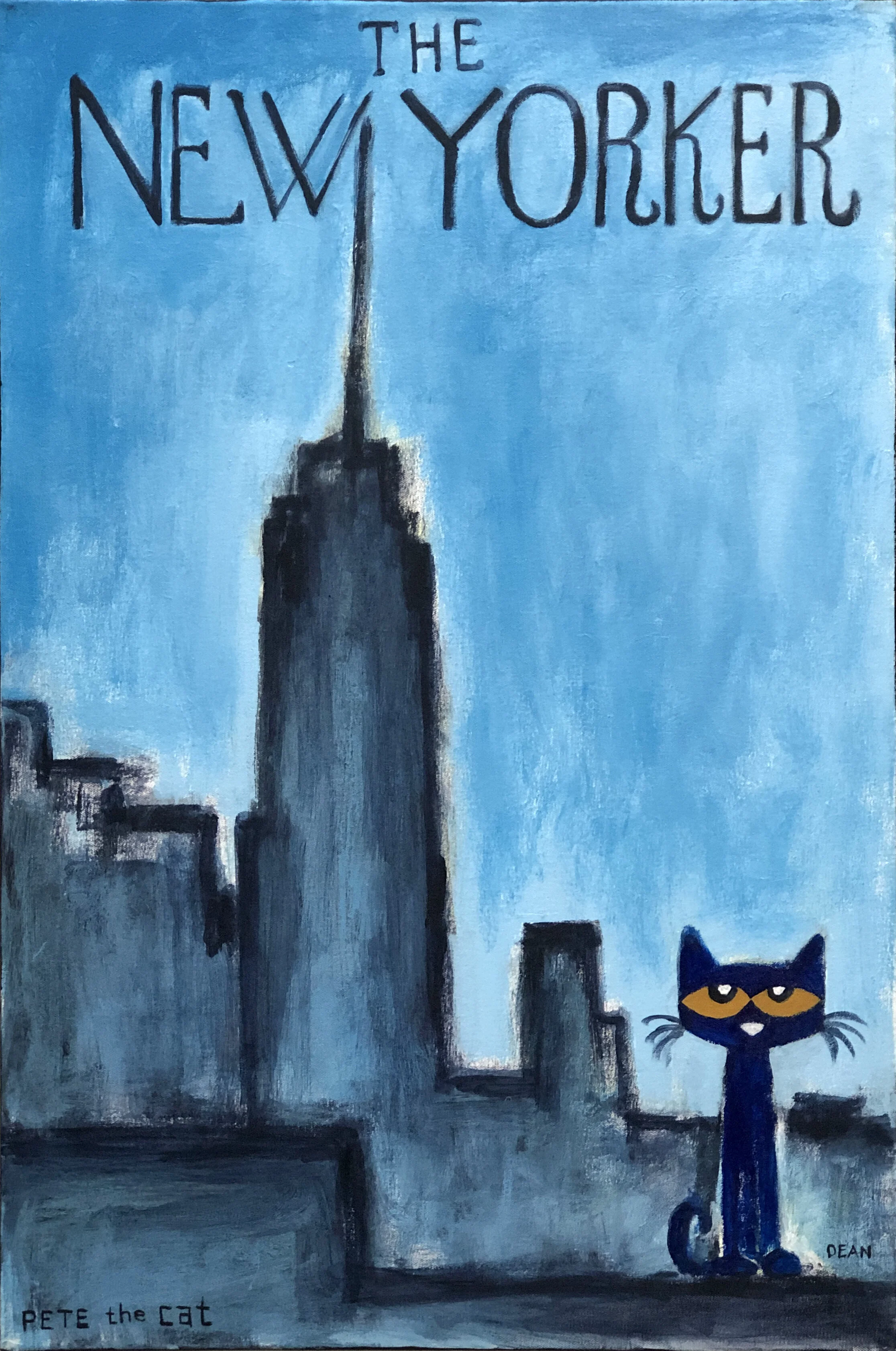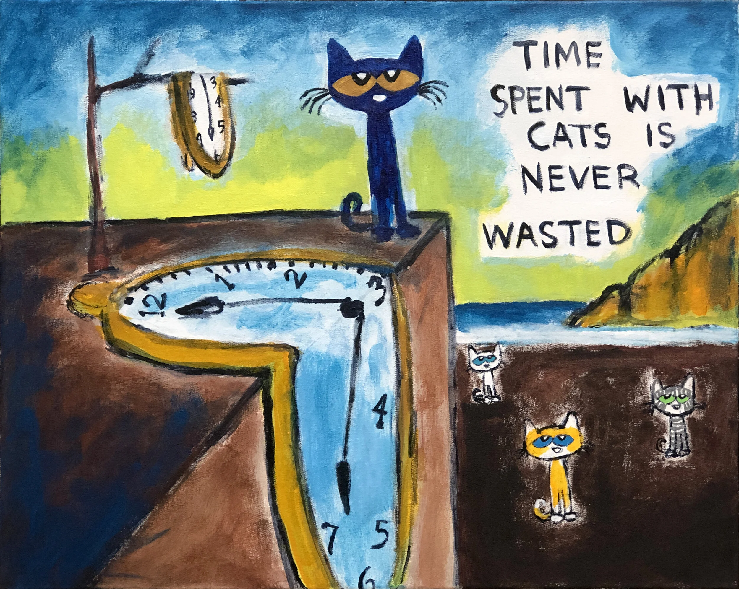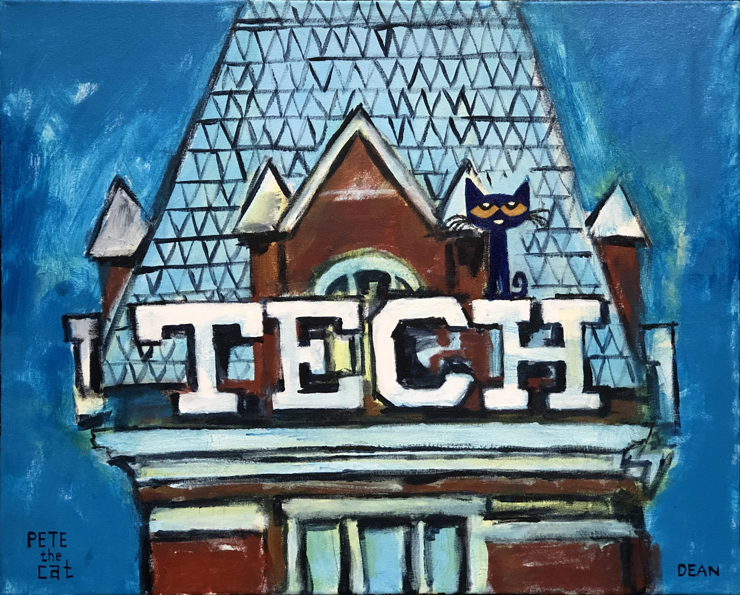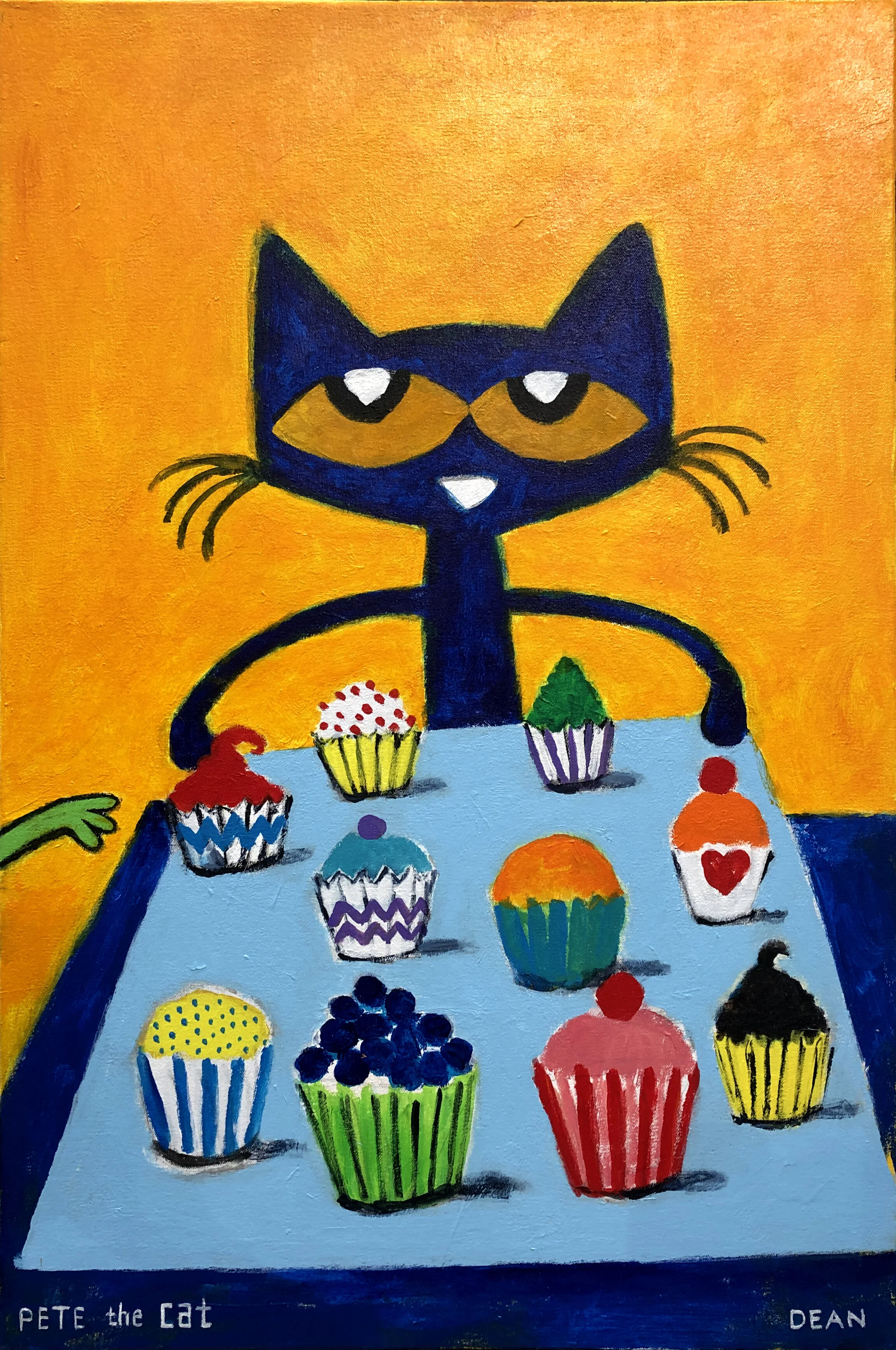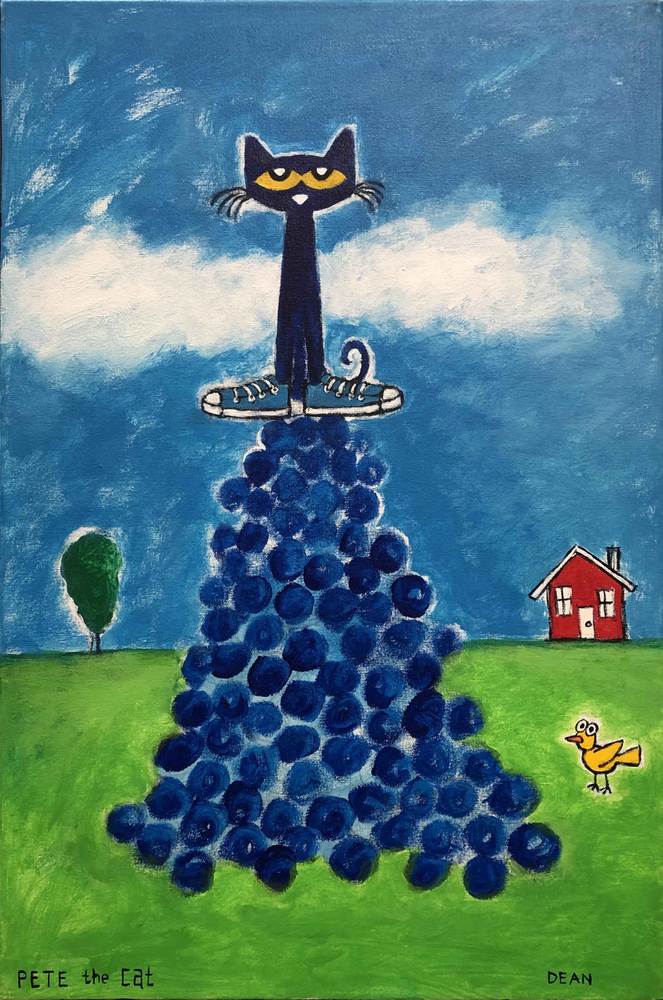 It was during this time that he began creating paintings and drawing of his cat, Pete. The little blue cat showed up as a character in James’s artwork around 1999 and has been a permanent fixture ever since.