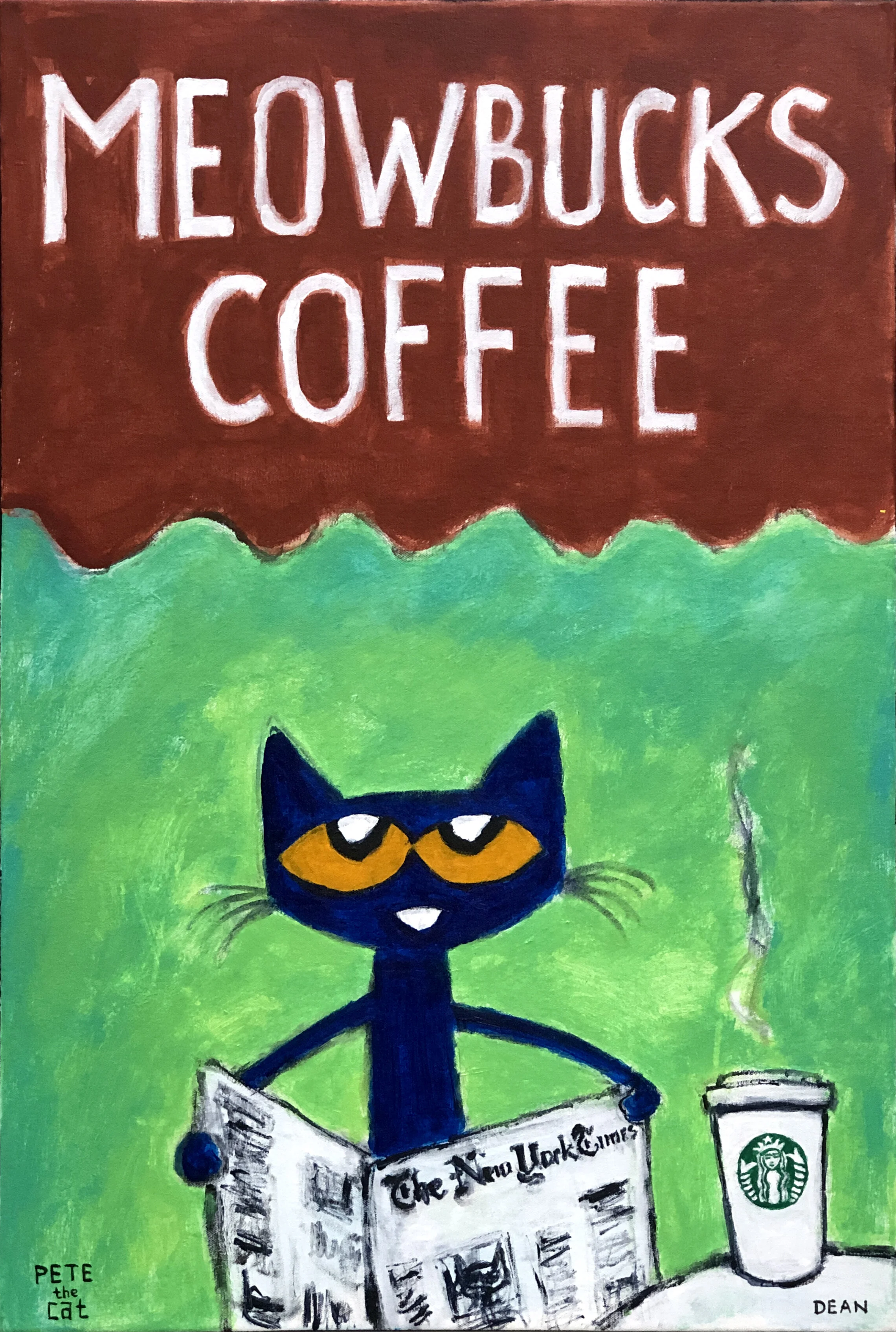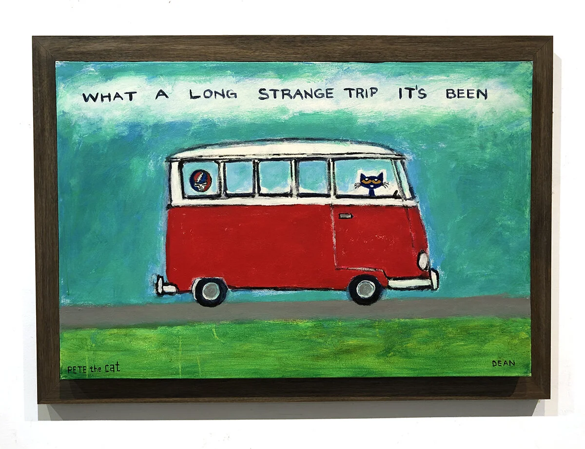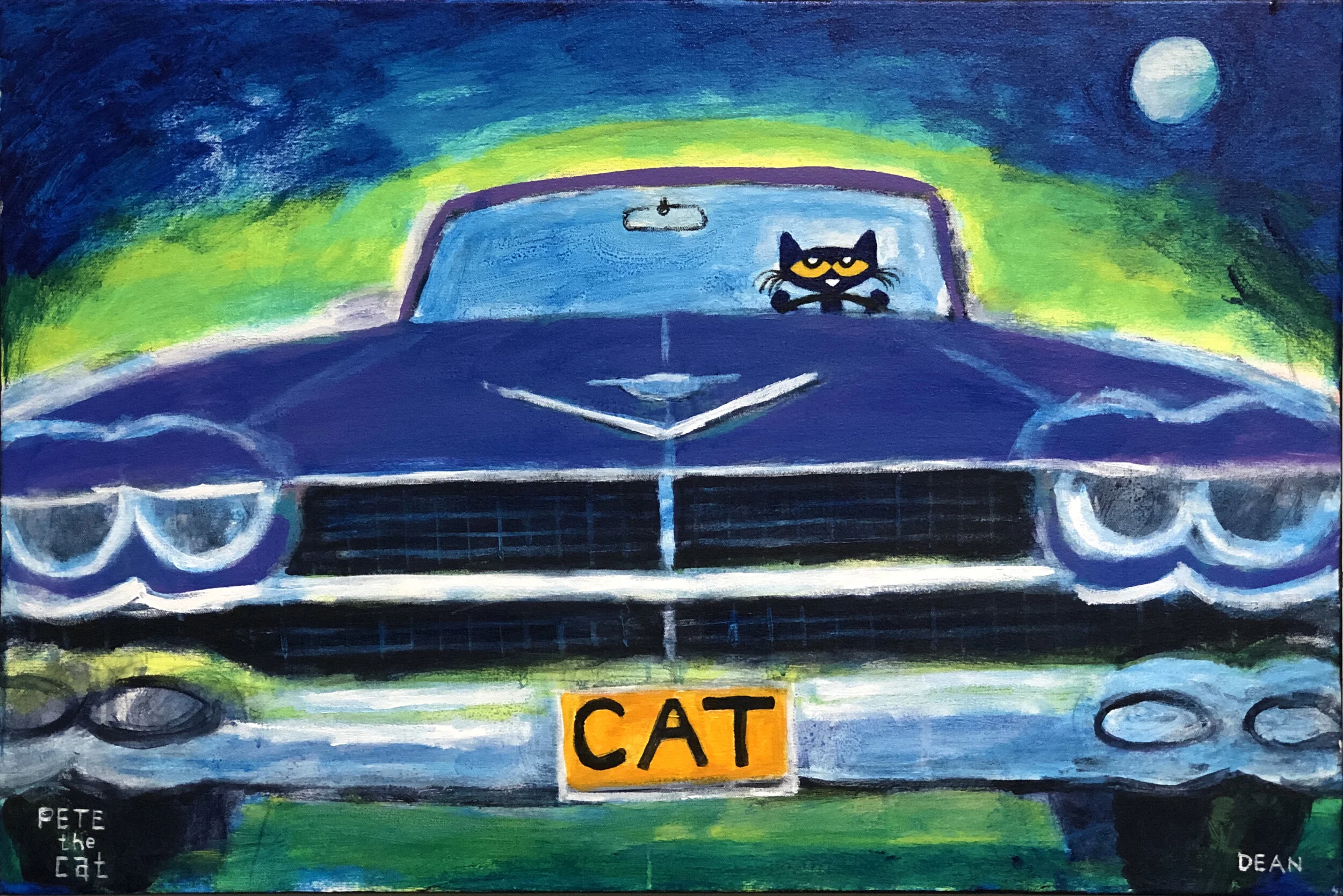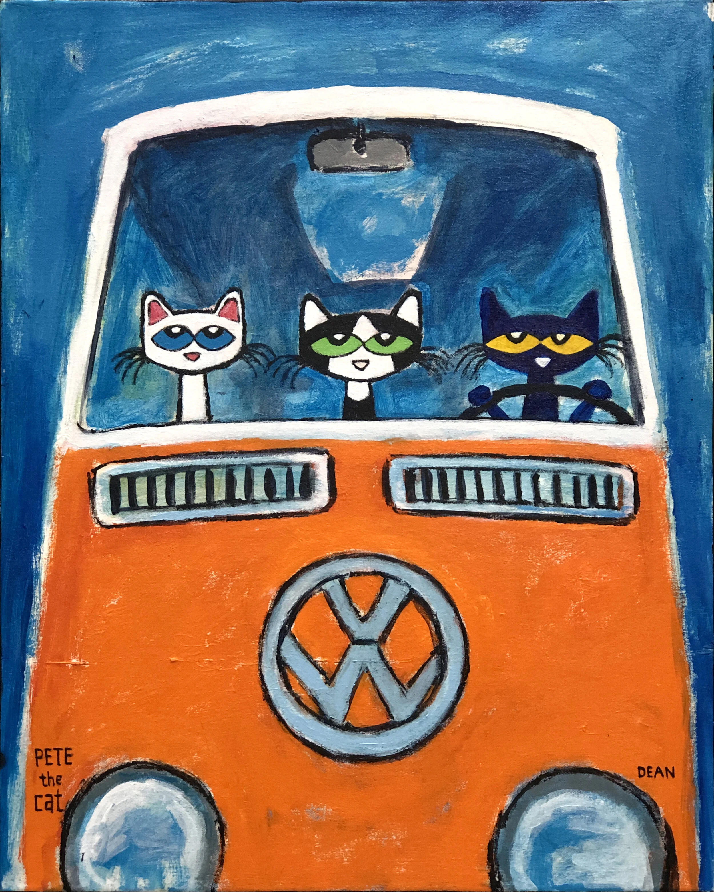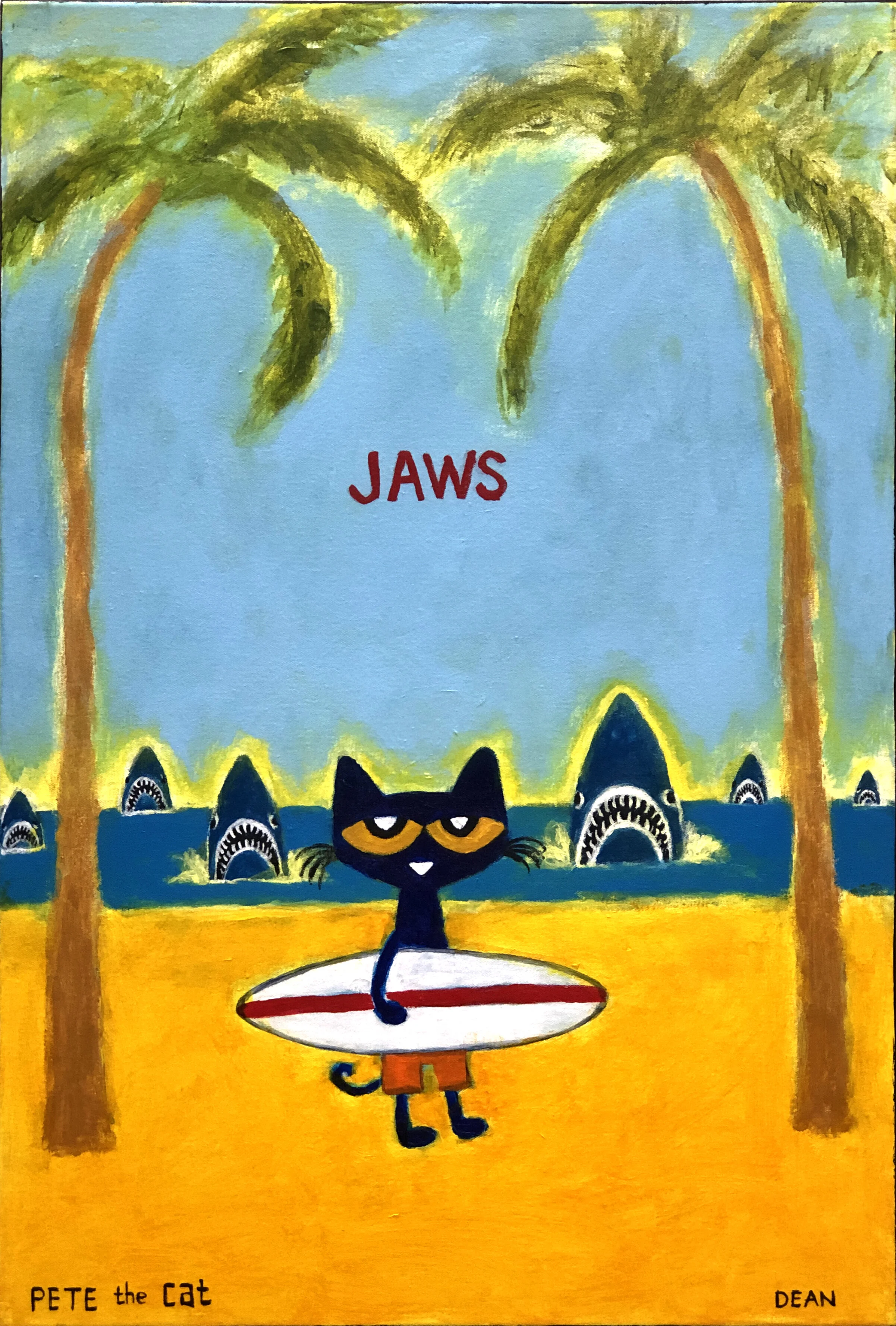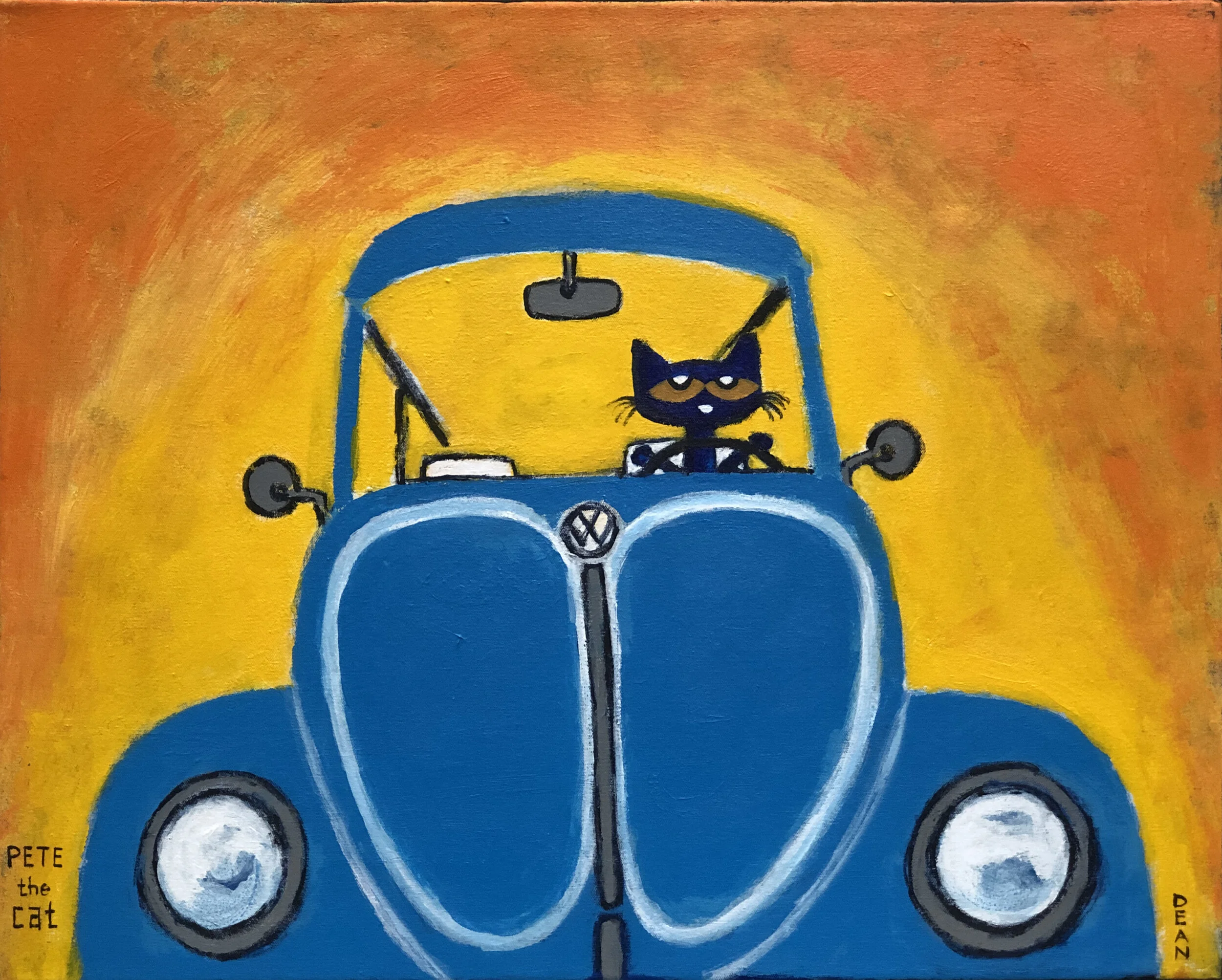 It was during this time that he began creating paintings and drawing of his cat, Pete. The little blue cat showed up as a character in James’s artwork around 1999 and has been a permanent fixture ever since.