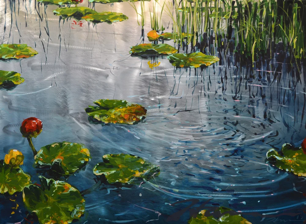 Scott Harris is an aluminum artist and sculptor working and showing primarily in the southeast. Born in Fargo, North Dakota, Scott re-located to the mountains of NC in 1996. He completed his BA in Visual Arts from Brevard College with an emphasis in both painting and sculpture. It was there he first experimented with painting on aluminum due to its flexible surface. As the process evolved, he discovered the reflective quality of the material added depth and movement to his art.